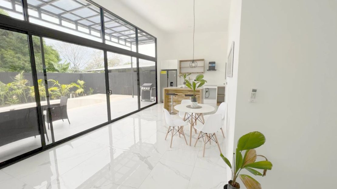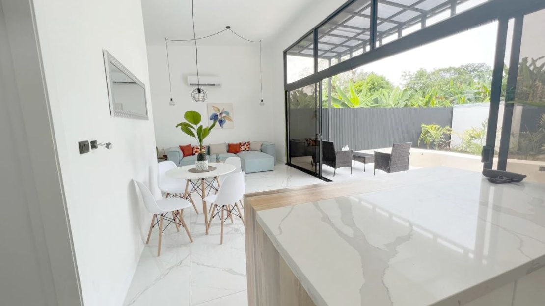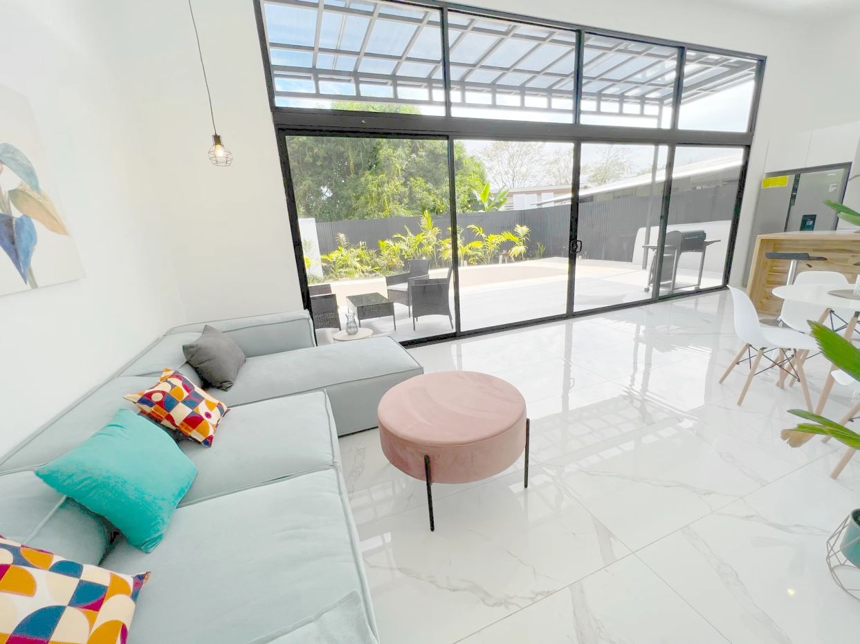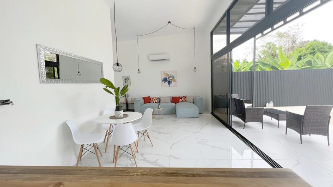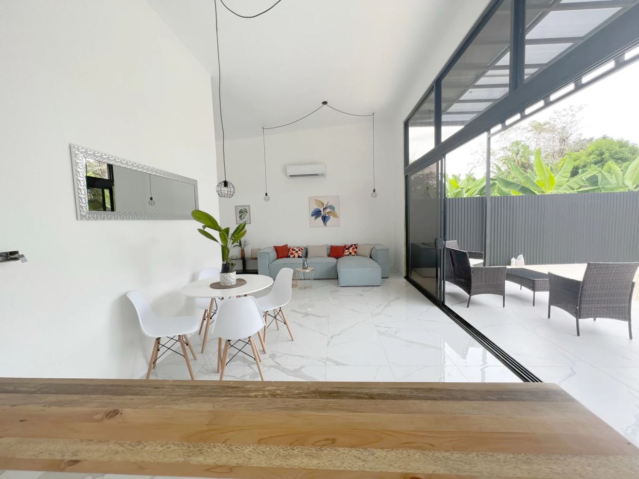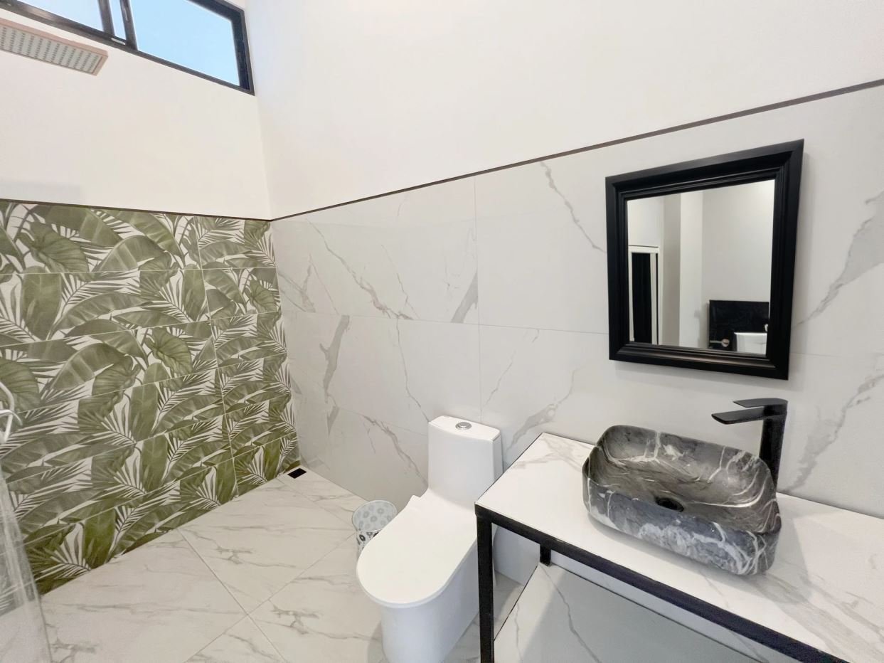 The villa features three spacious bedrooms and three luxurious bathrooms, each elegantly finished with designer tiles. The open-plan living areas are designed to maximize natural light, creating a bright and welcoming atmosphere. Large windows throughout the home offer views of the tropical garden and the impressive 7 x 3-meter designer pool, seamlessly blending the indoor and outdoor living spaces for a true Costa Rican lifestyle.