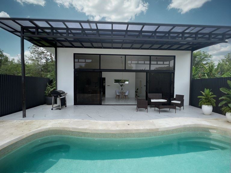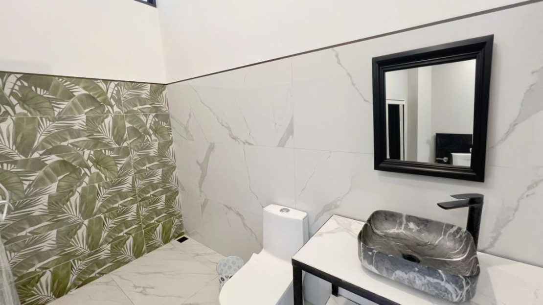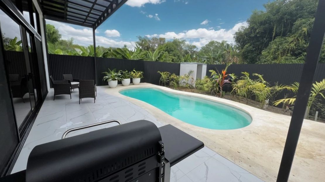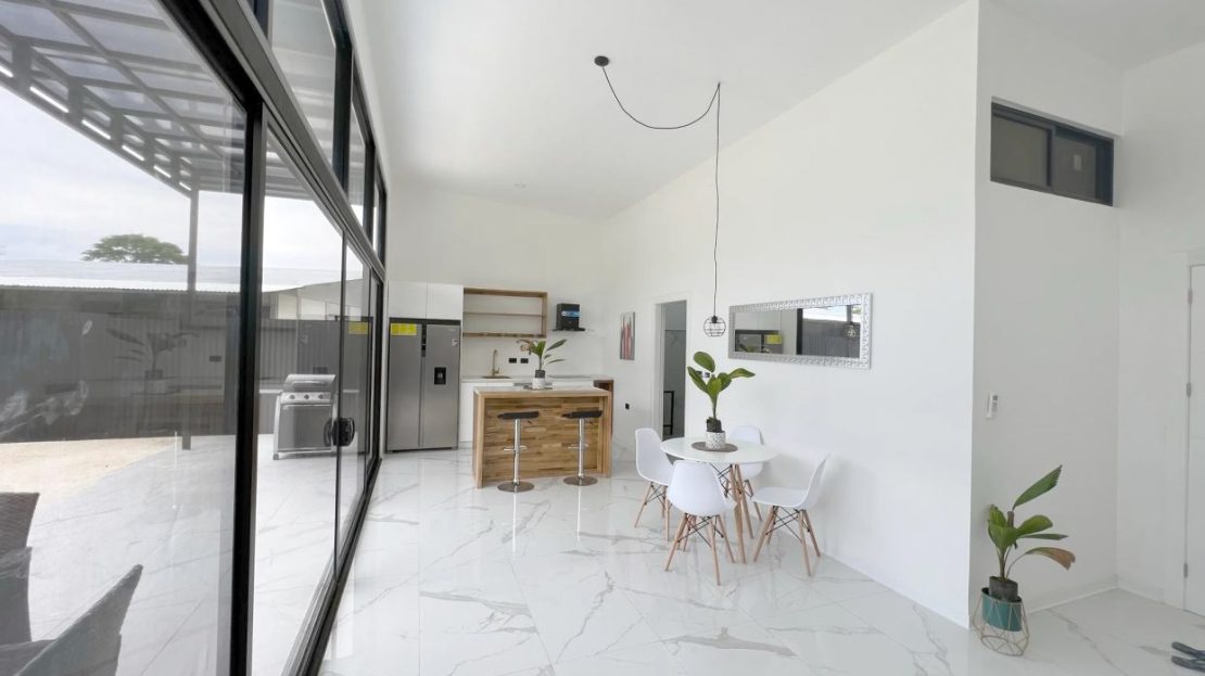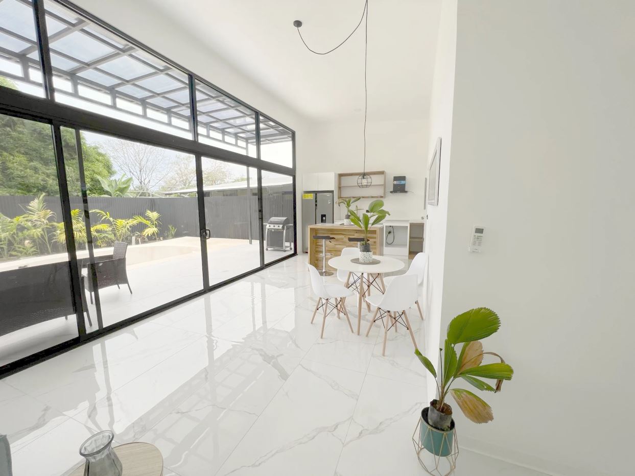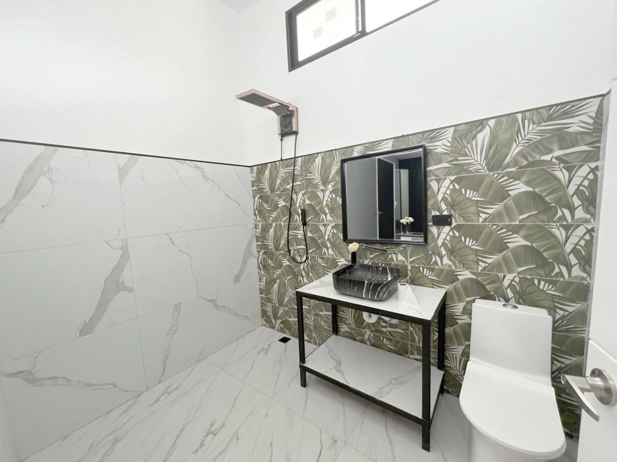 The villa features three spacious bedrooms and three luxurious bathrooms, each elegantly finished with designer tiles. The open-plan living areas are designed to maximize natural light, creating a bright and welcoming atmosphere. Large windows throughout the home offer views of the tropical garden and the impressive 7 x 3-meter designer pool, seamlessly blending the indoor and outdoor living spaces for a true Costa Rican lifestyle.