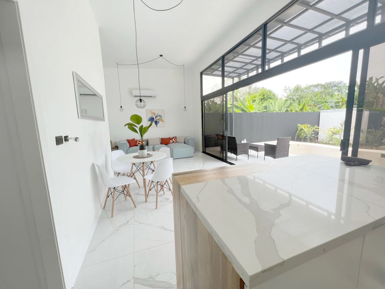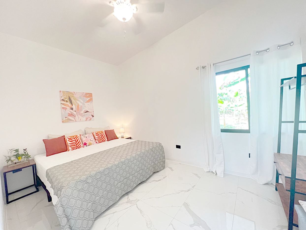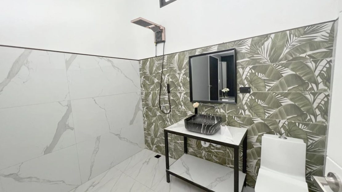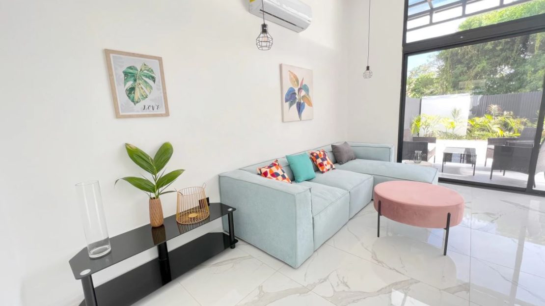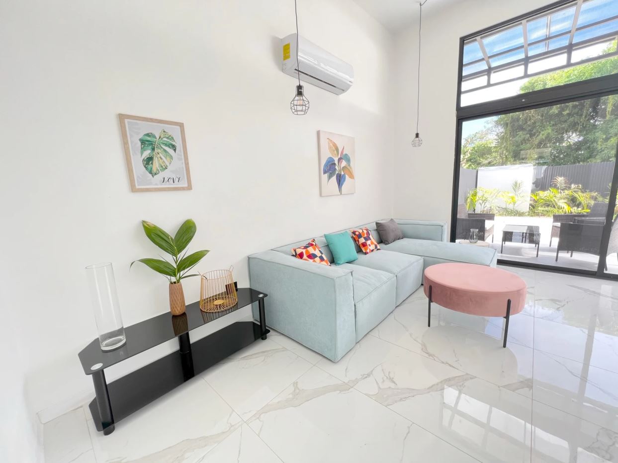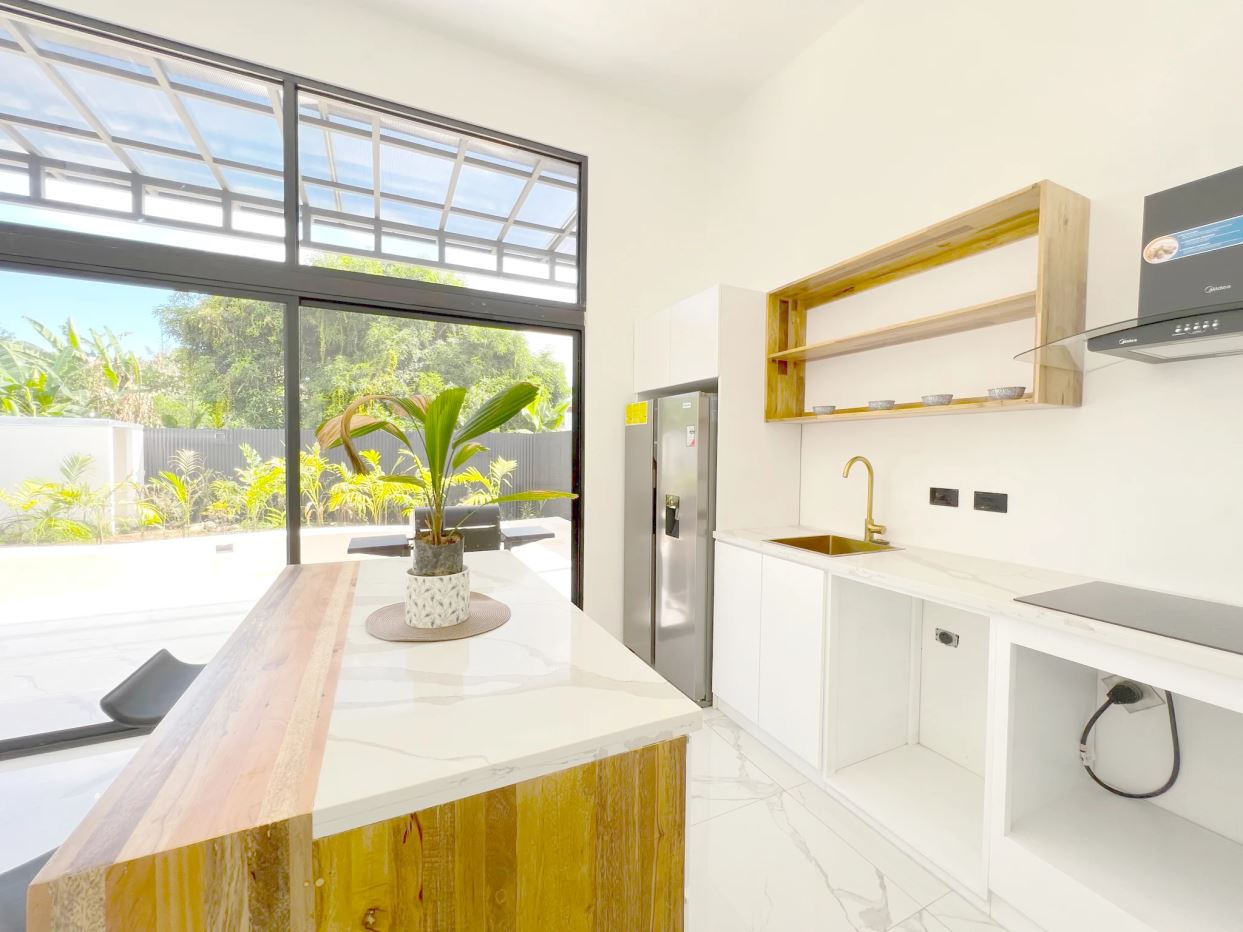 The villa features three spacious bedrooms and three luxurious bathrooms, each elegantly finished with designer tiles. The open-plan living areas are designed to maximize natural light, creating a bright and welcoming atmosphere. Large windows throughout the home offer views of the tropical garden and the impressive 7 x 3-meter designer pool, seamlessly blending the indoor and outdoor living spaces for a true Costa Rican lifestyle.