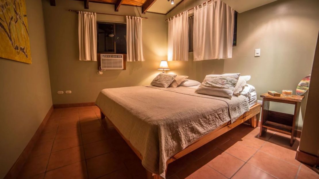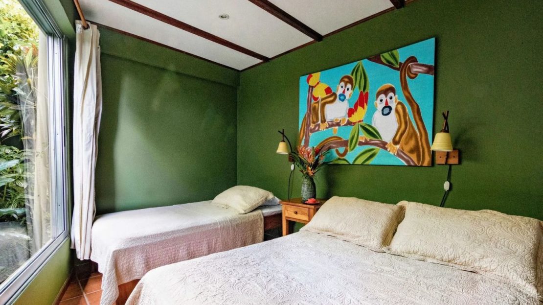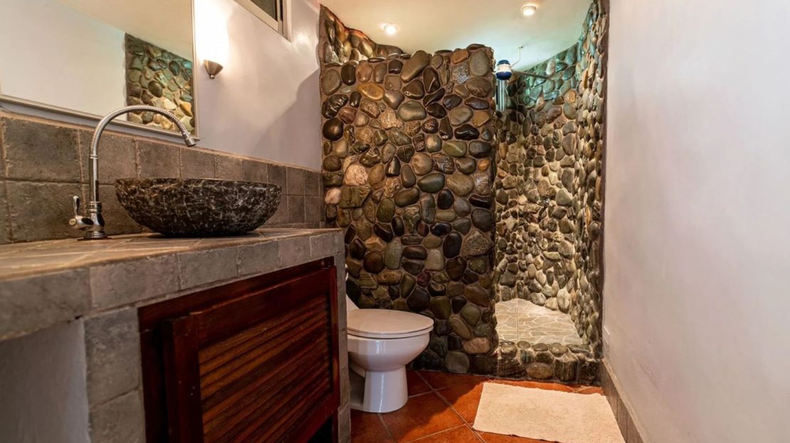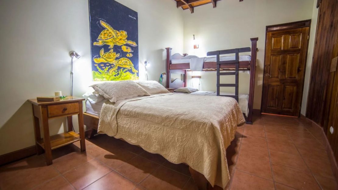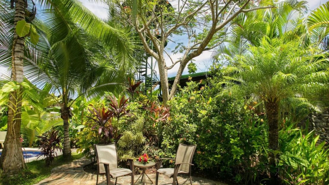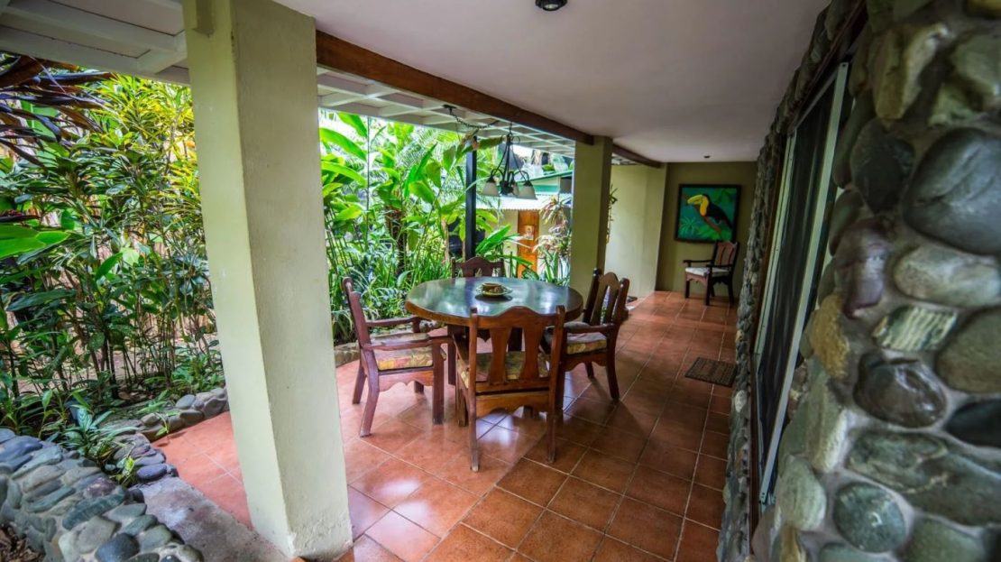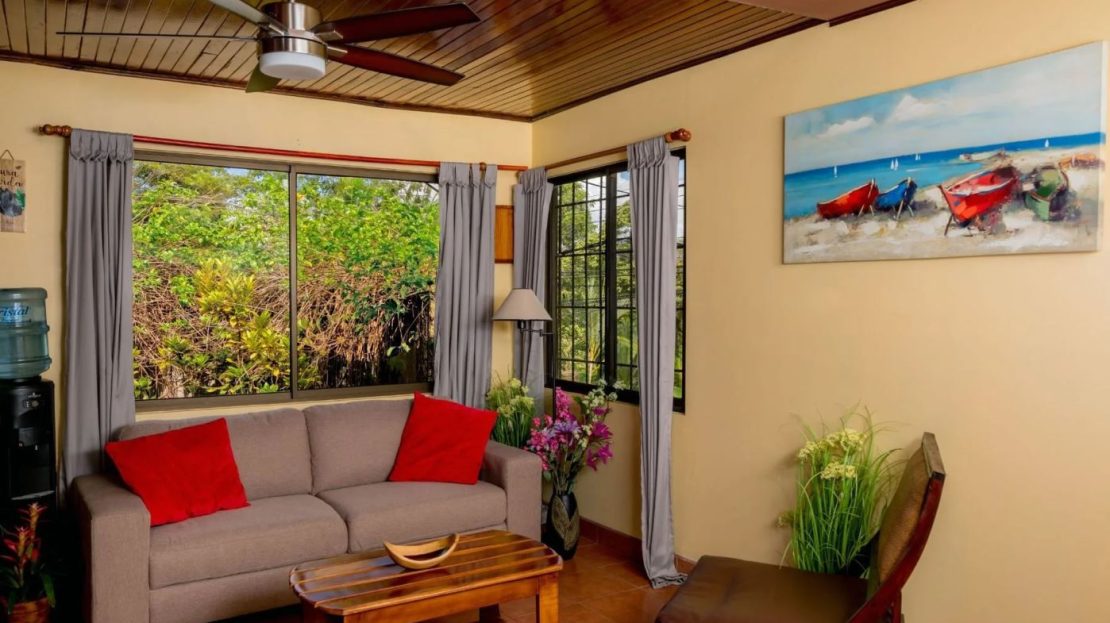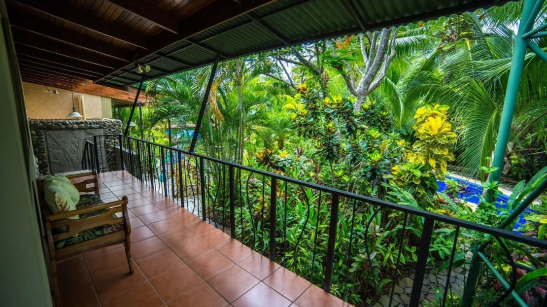 The penthouse showcases the property’s charm with its expansive three-bedroom, two-bathroom layout. It features a large living and dining area that floods with natural light and overlooks the pool and tropical gardens. This villa includes a cook’s kitchen with new granite countertops, a stunning Guanacaste wood dining table, and a private balcony with garden views. Additionally, the “Secret Garden” suite, a two-bedroom, one-bathroom rental, has been recently renovated with new appliances. Guests appreciate the natural ambiance, highlighted by custom hardwoods and river rock showers, and the suite’s private porch nestled in the tropical gardens. The Hideaway suite, a one-bedroom space, offers a secluded retreat with its own private stairway, ideal for couples seeking privacy and charm.