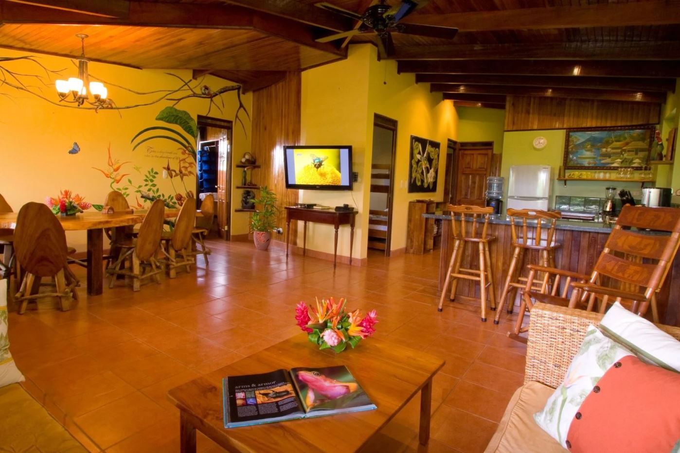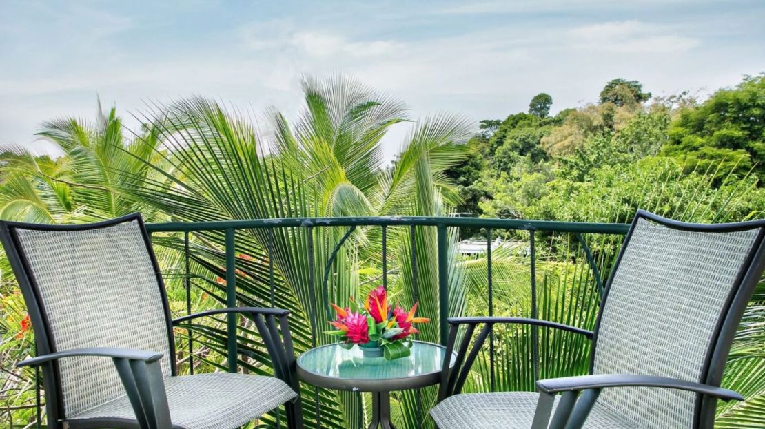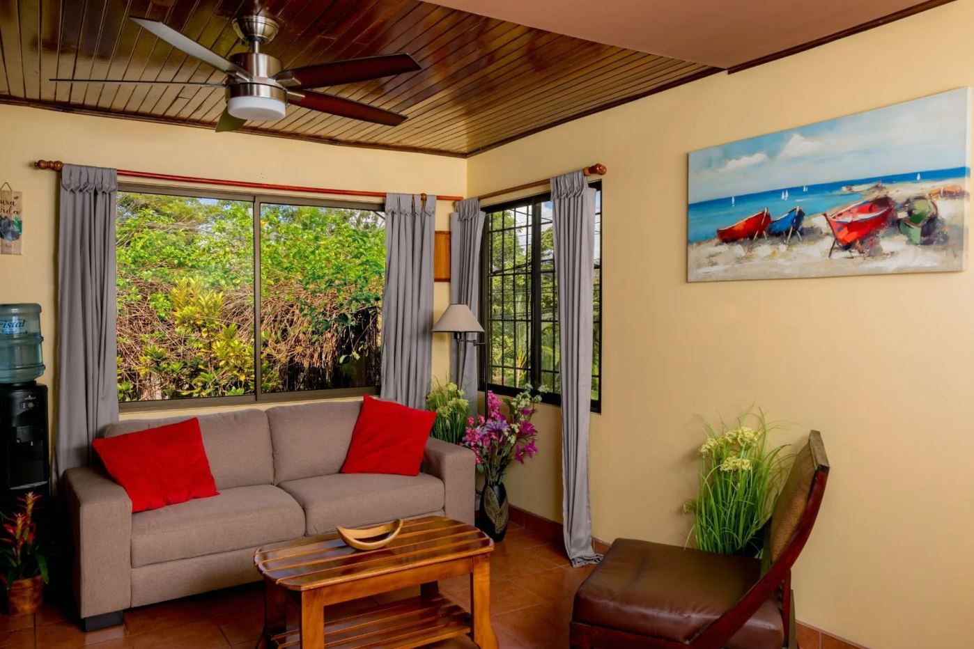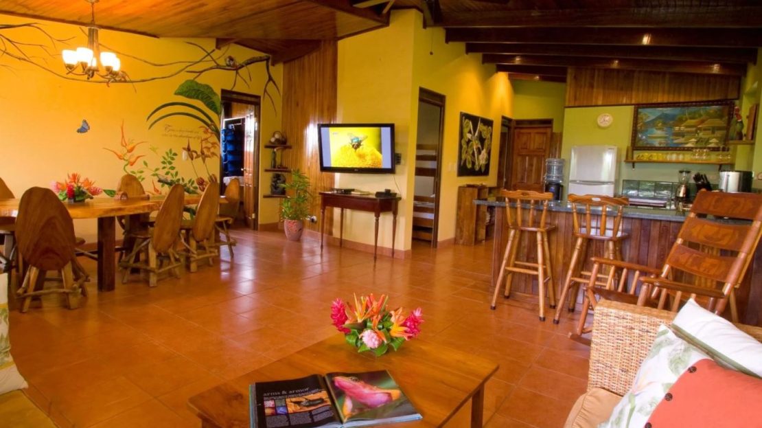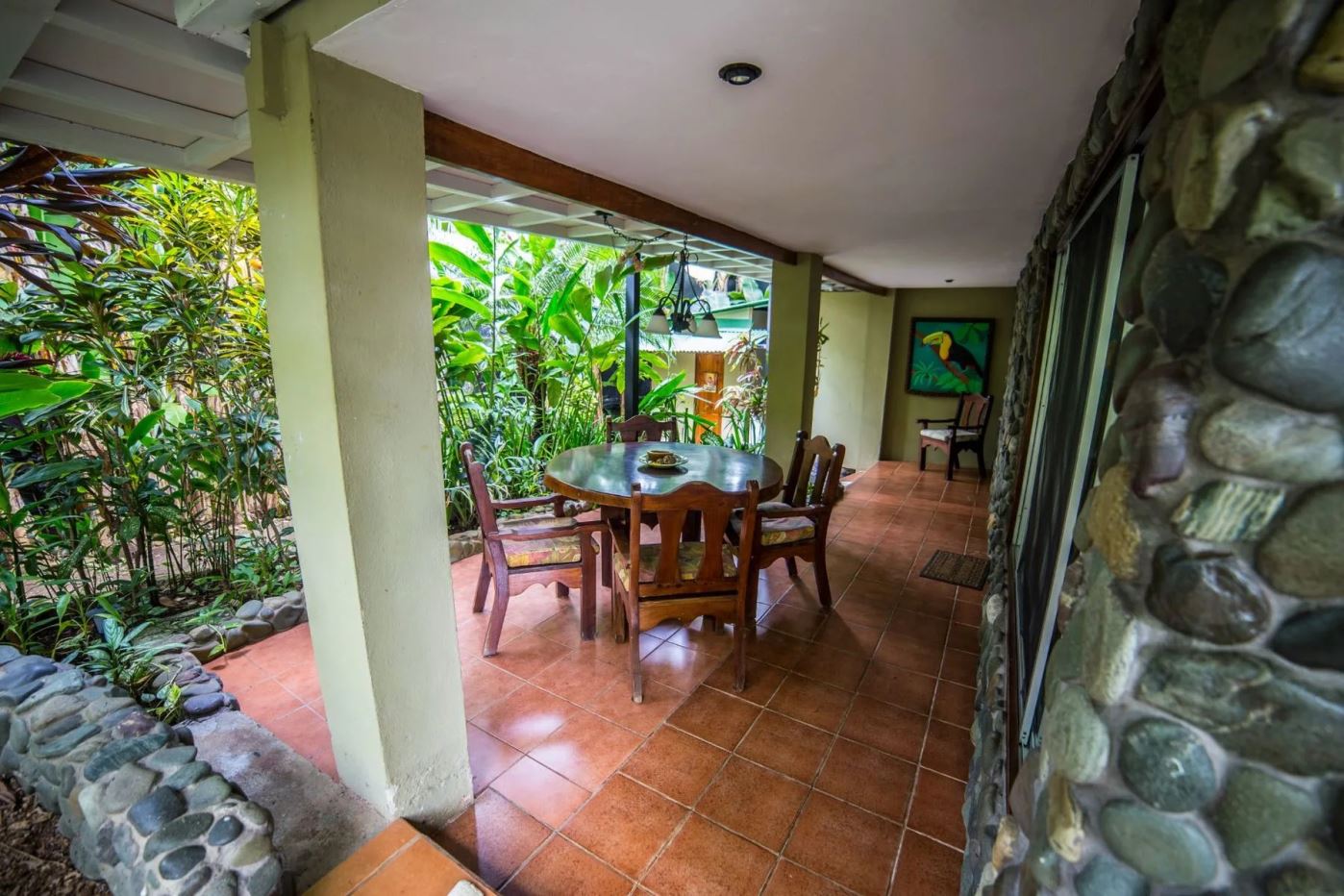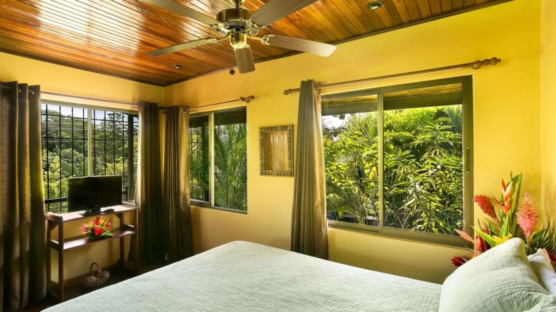 The penthouse showcases the property’s charm with its expansive three-bedroom, two-bathroom layout. It features a large living and dining area that floods with natural light and overlooks the pool and tropical gardens. This villa includes a cook’s kitchen with new granite countertops, a stunning Guanacaste wood dining table, and a private balcony with garden views. Additionally, the “Secret Garden” suite, a two-bedroom, one-bathroom rental, has been recently renovated with new appliances. Guests appreciate the natural ambiance, highlighted by custom hardwoods and river rock showers, and the suite’s private porch nestled in the tropical gardens. The Hideaway suite, a one-bedroom space, offers a secluded retreat with its own private stairway, ideal for couples seeking privacy and charm.