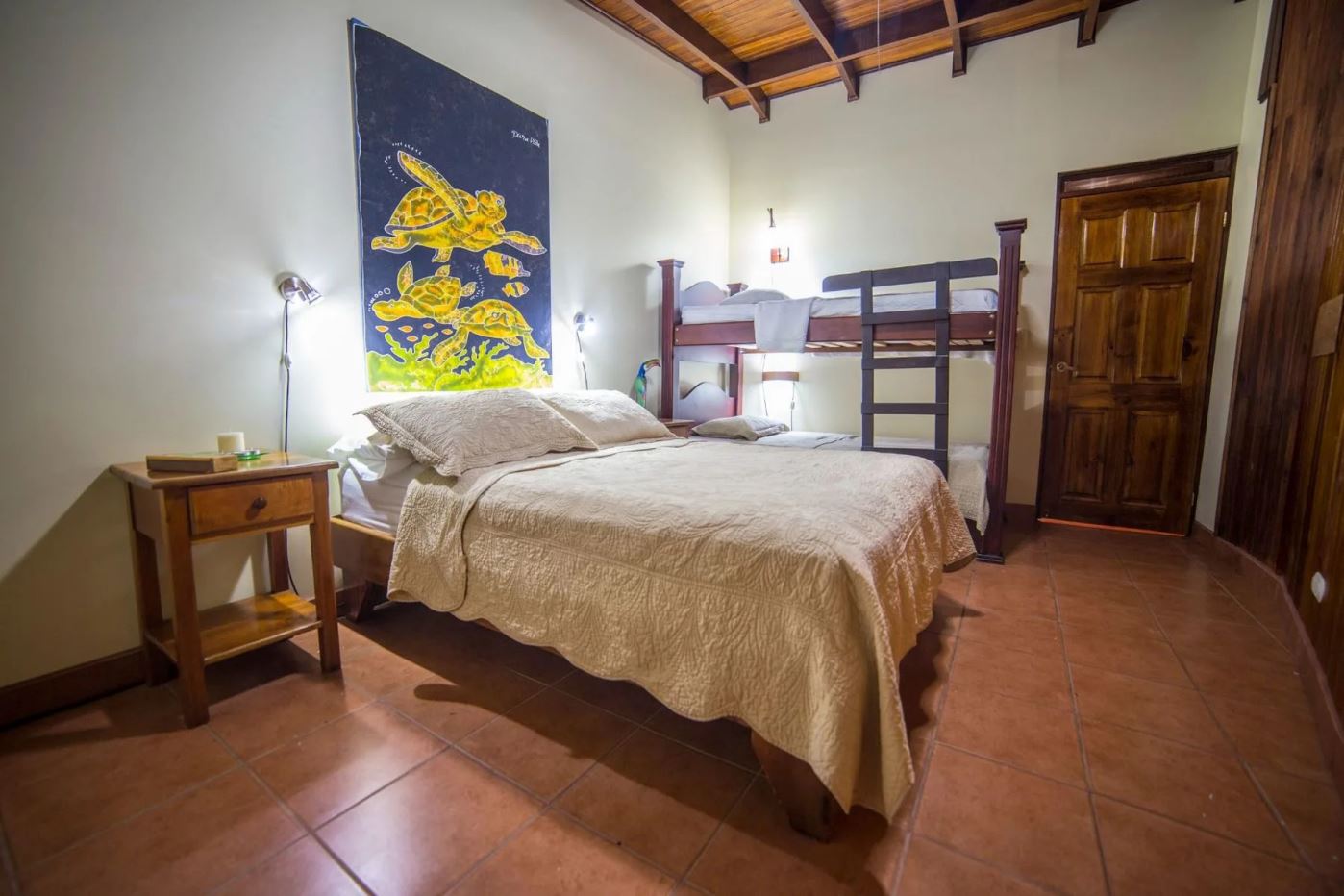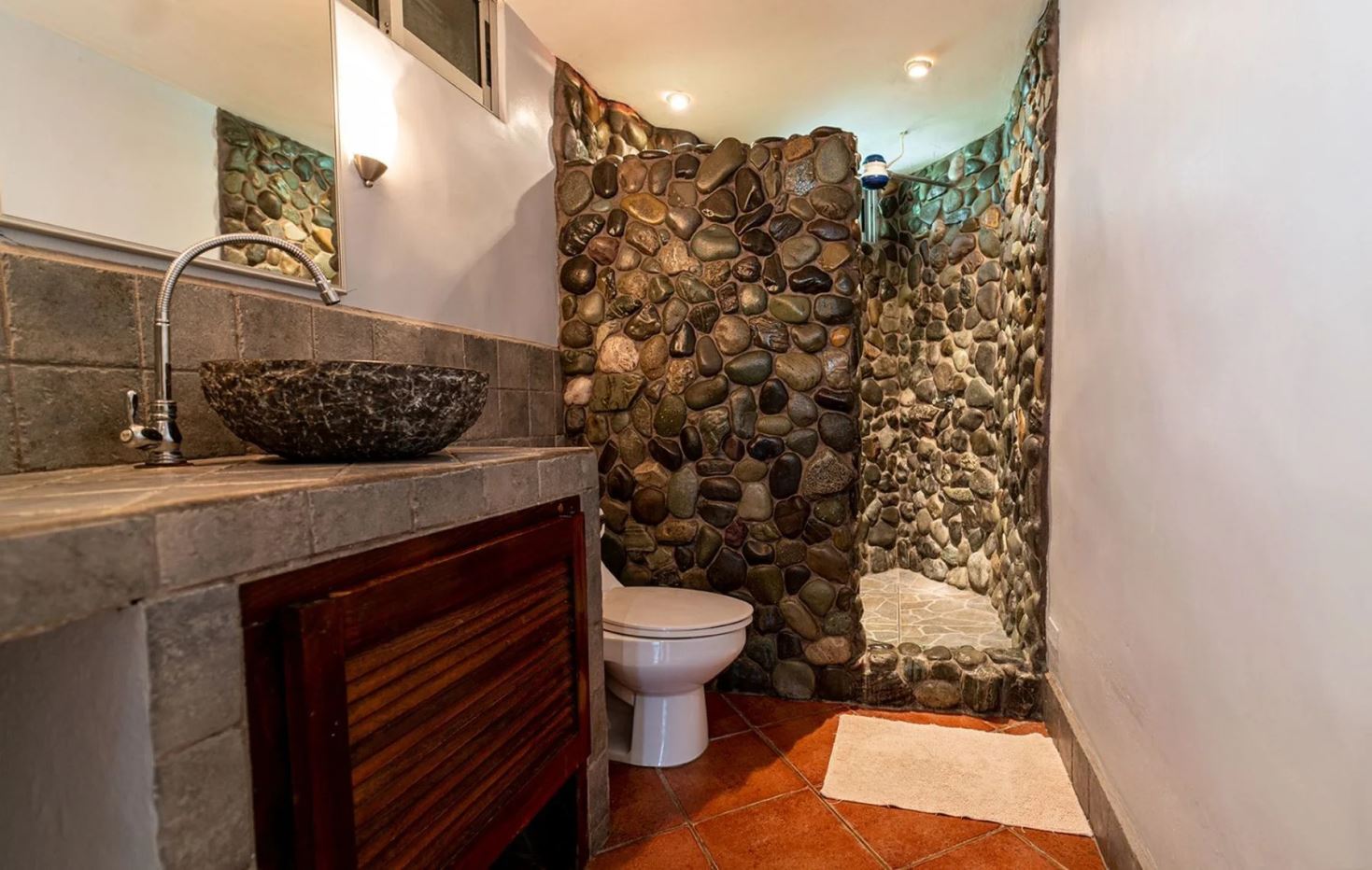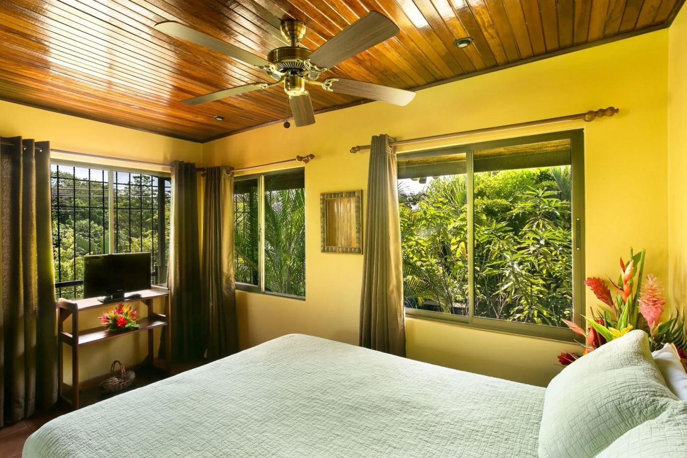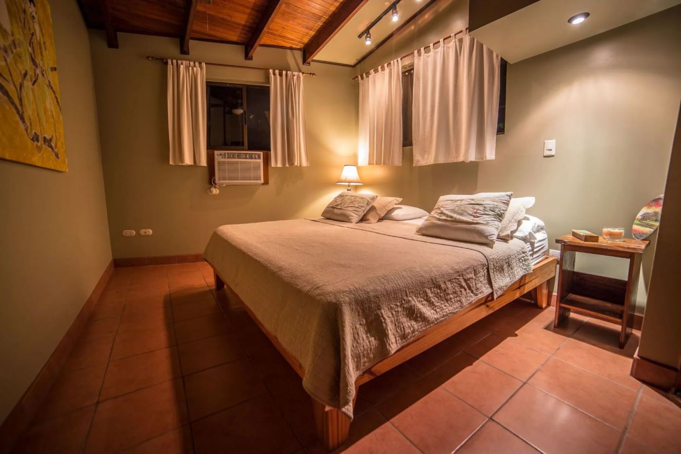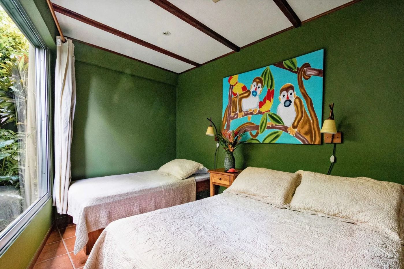 The penthouse showcases the property’s charm with its expansive three-bedroom, two-bathroom layout. It features a large living and dining area that floods with natural light and overlooks the pool and tropical gardens. This villa includes a cook’s kitchen with new granite countertops, a stunning Guanacaste wood dining table, and a private balcony with garden views. Additionally, the “Secret Garden” suite, a two-bedroom, one-bathroom rental, has been recently renovated with new appliances. Guests appreciate the natural ambiance, highlighted by custom hardwoods and river rock showers, and the suite’s private porch nestled in the tropical gardens. The Hideaway suite, a one-bedroom space, offers a secluded retreat with its own private stairway, ideal for couples seeking privacy and charm.
