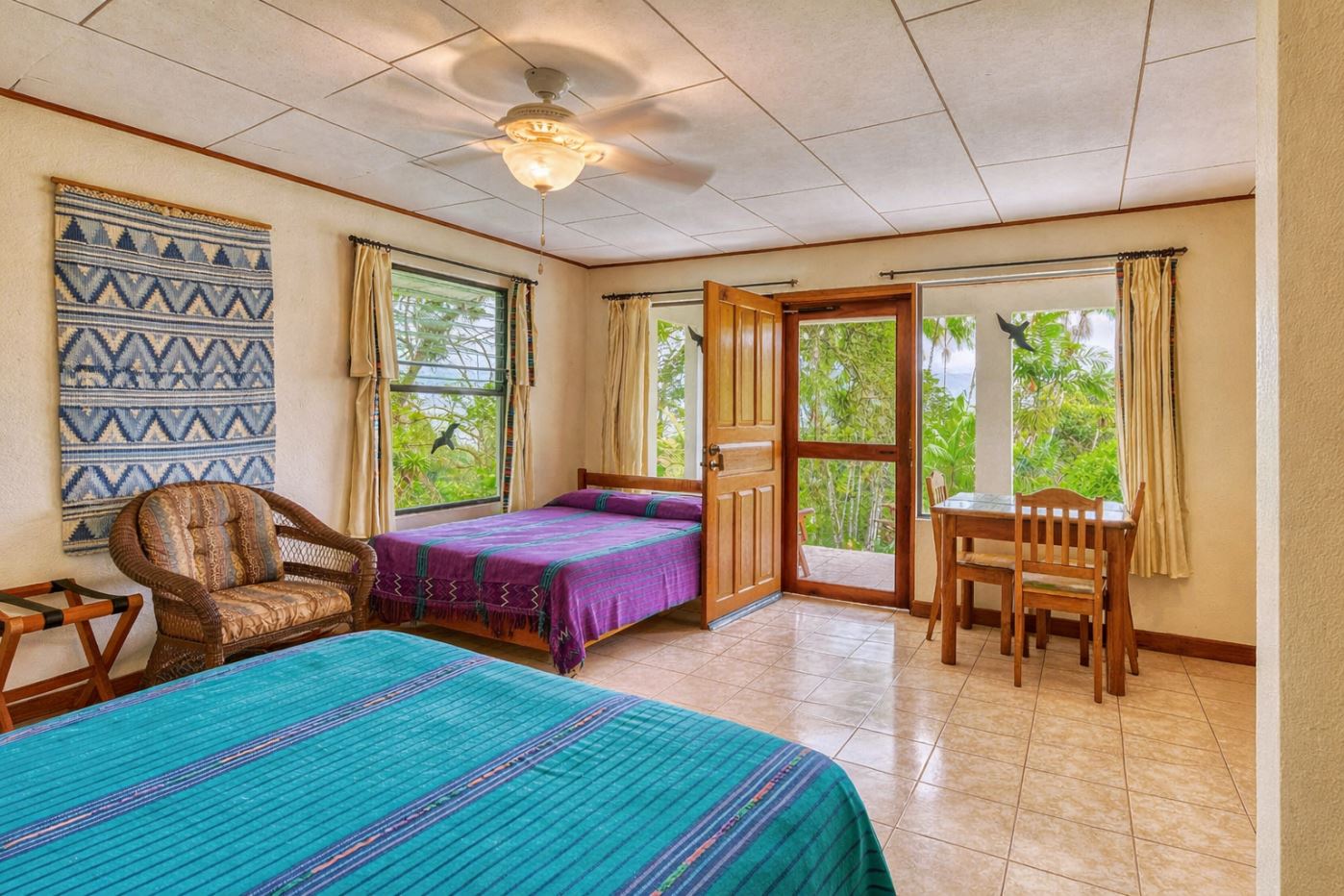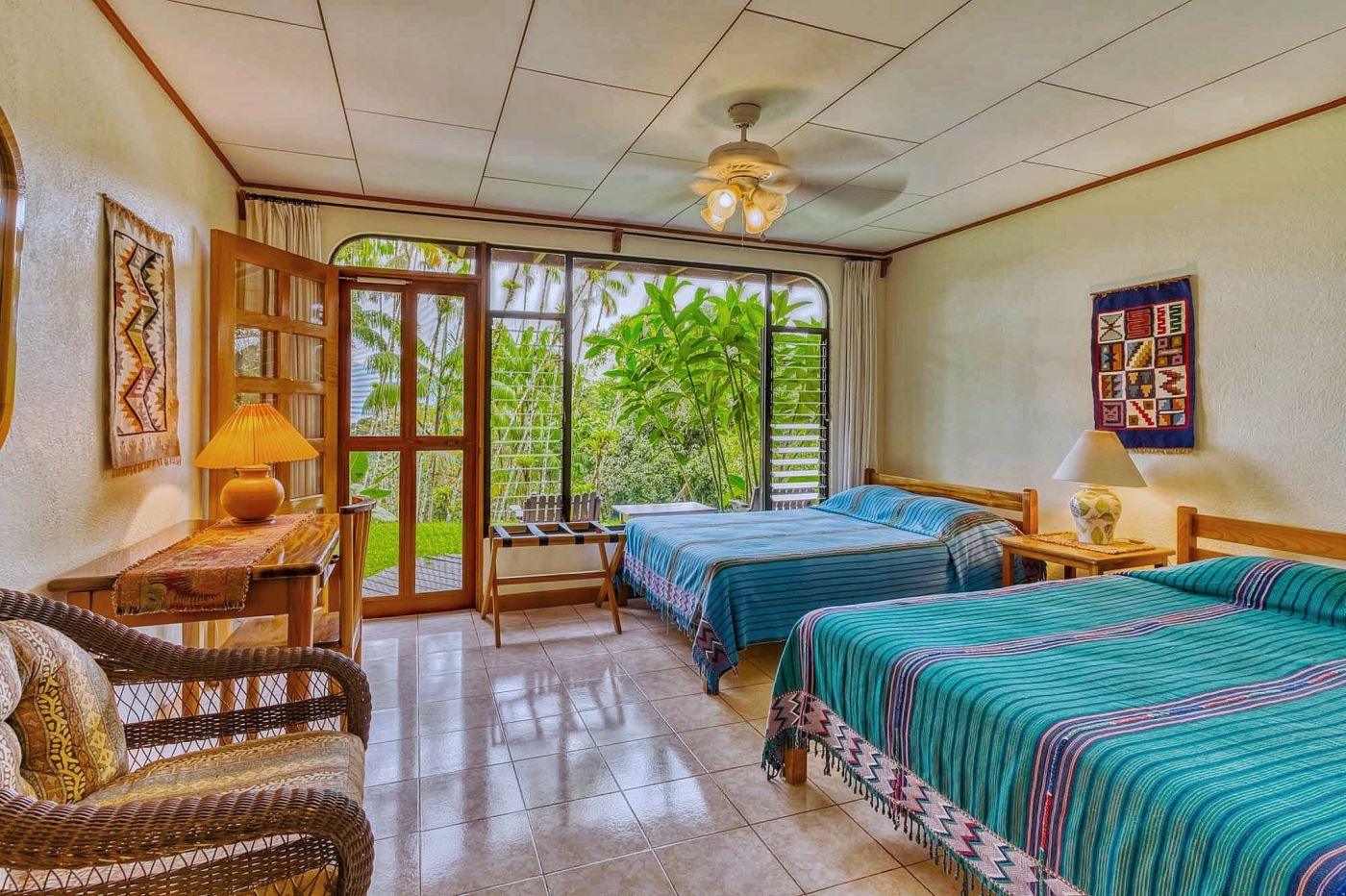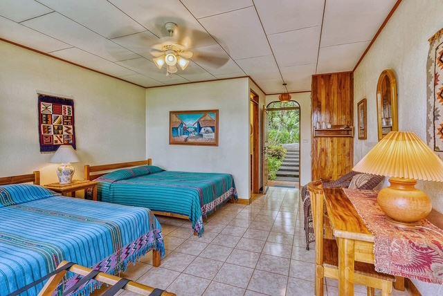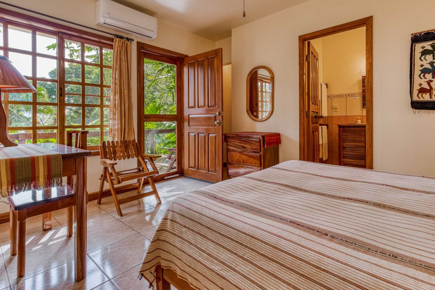 Each guest room features a spacious ensuite bathroom, traditional tiled floors, and expansive windows and glass doors that open onto covered private balconies and terraces overlooking the gardens and surrounding landscape. Thoughtfully designed with bespoke accents and custom-crafted wood furnishings, each room is complemented by tapestries and original local artwork, creating spaces that reflect the rich culture and natural beauty of Costa Rica.