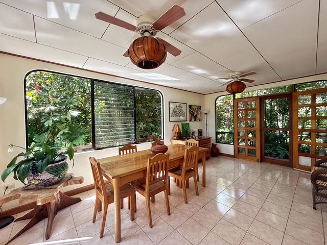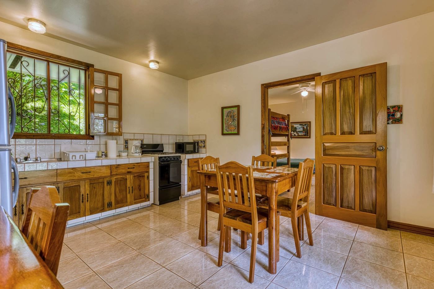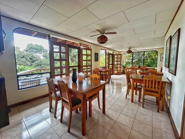 Opening through traditional wood-framed French doors from the dining area, an expansive wraparound deck provides additional space for guests to relax, dine outdoors, and take in tranquil views of Lake Arenal and the surrounding landscape. A striking terracotta spiral staircase rises from this level to the guest rooms above, adding a distinctive architectural feature that reflects the property’s Spanish Colonial character.